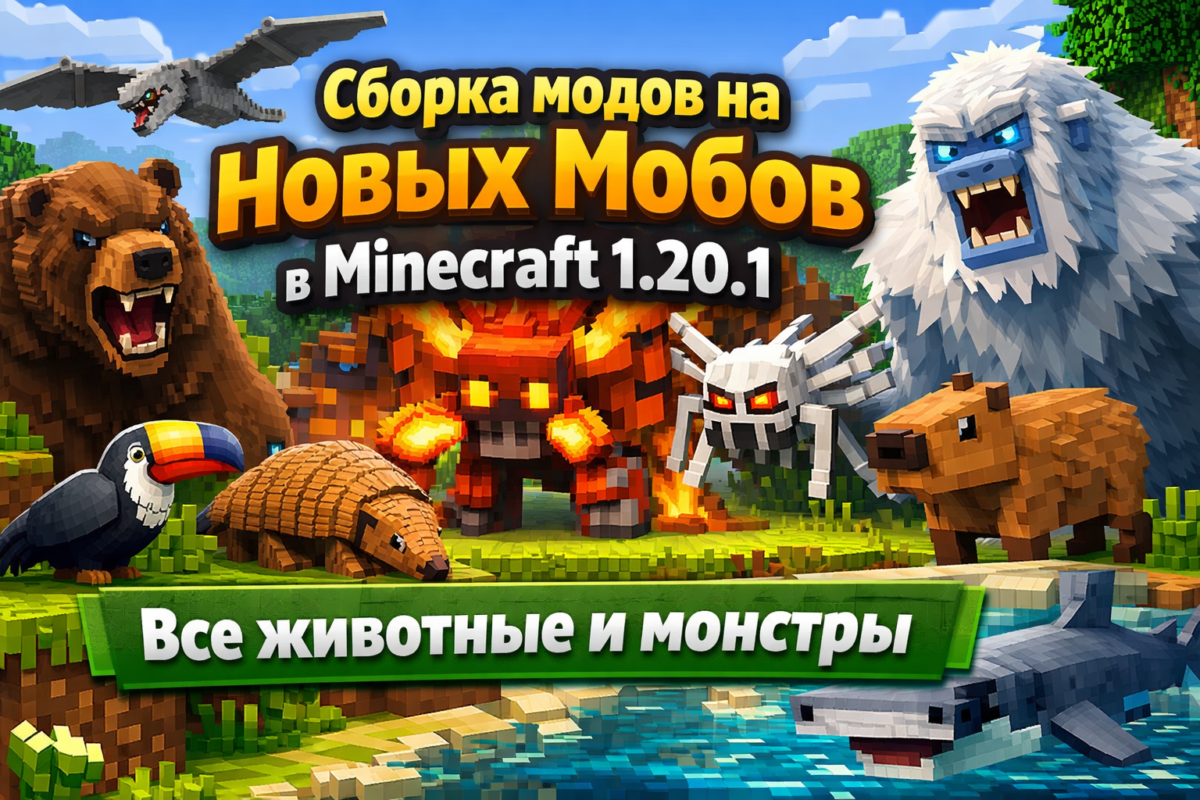 Готовая сборка модов на новых мобов для Minecraft 1.20.1 добавляет больше животных, существ и монстров, делая выживание, биомы и исследование мира заметно интереснее.