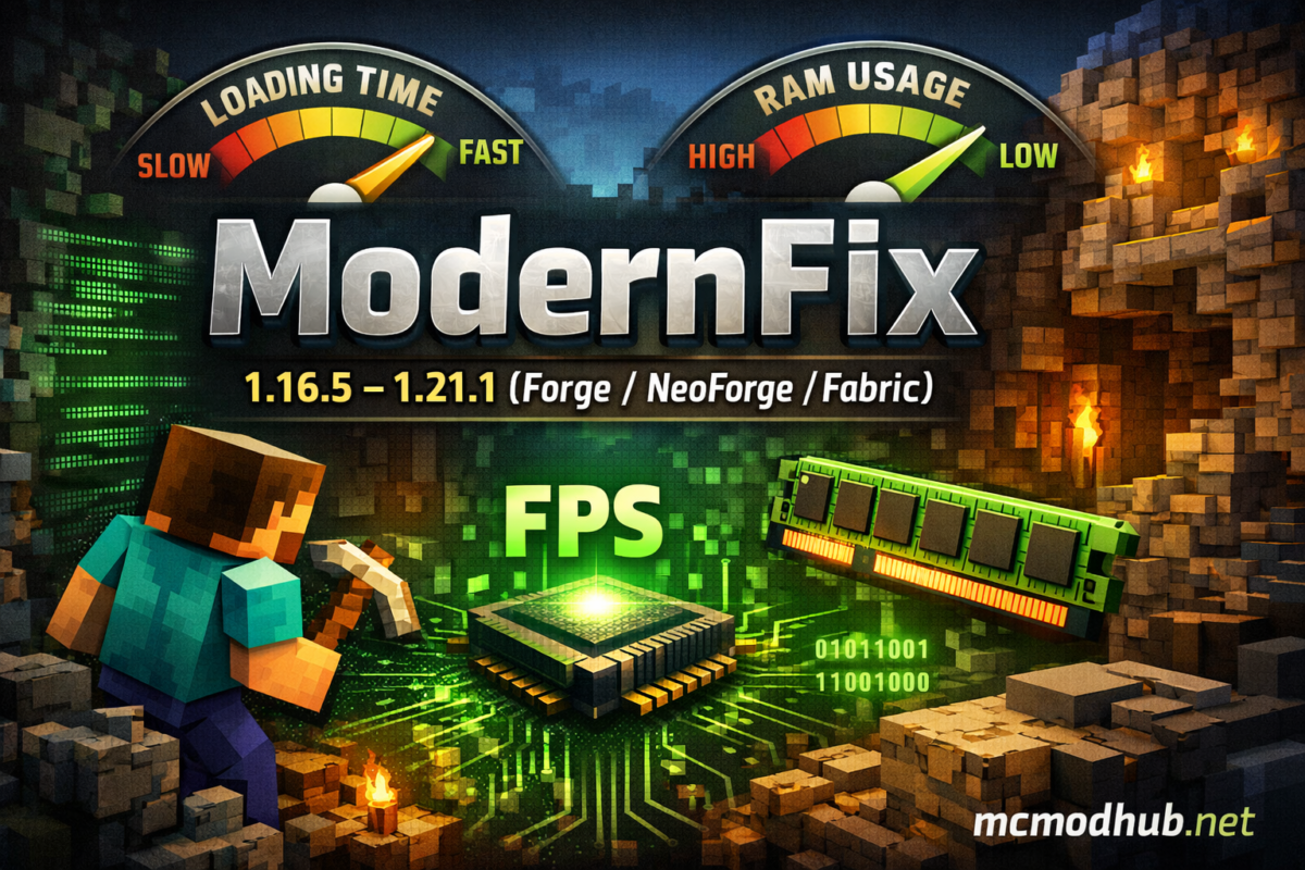ModernFix 1.16.5–1.21.1 для Forge, NeoForge и Fabric — мод для ускорения загрузки, снижения RAM и повышения стабильности Minecraft.