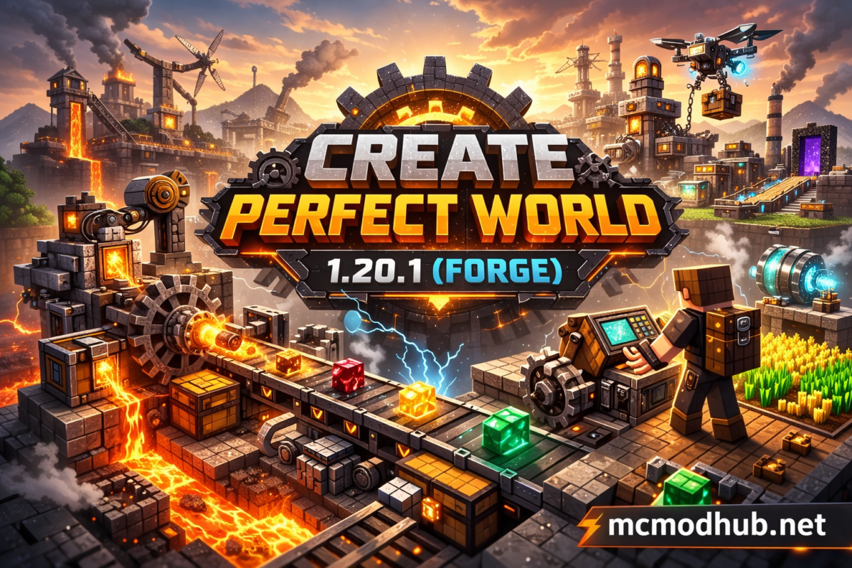 Create: Perfect World 1.20.1 Forge — техно-модпак вокруг Create с заводами, автоматизацией ресурсов и логичной системой развития без перегруза.