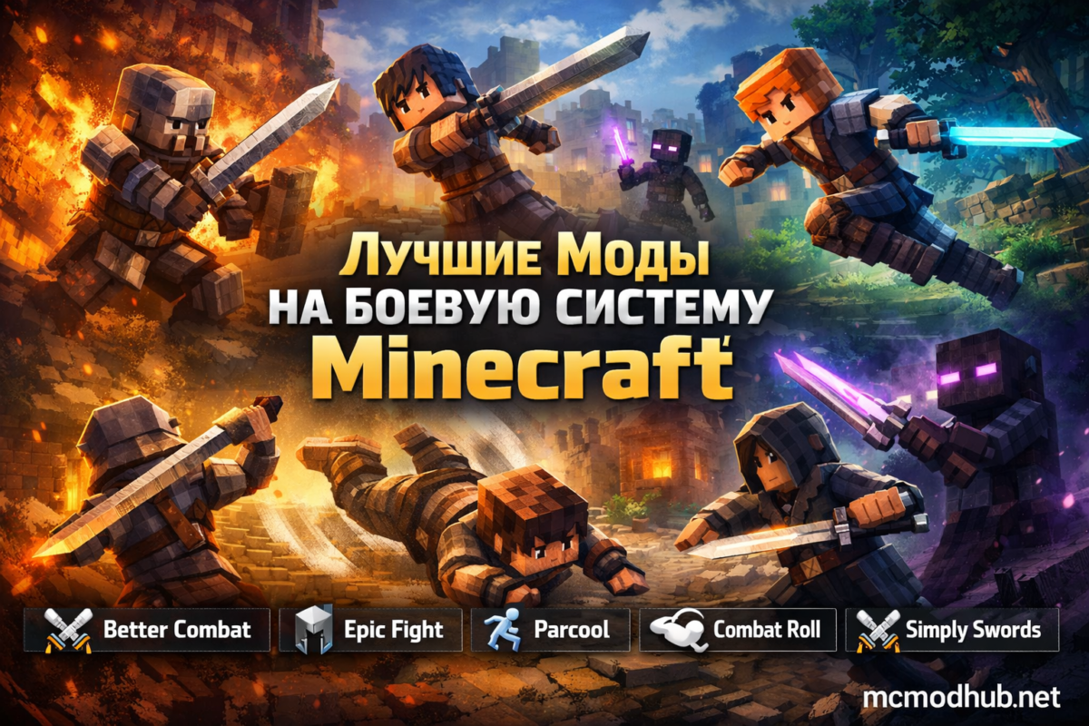 Если стандартная боевка Minecraft кажется слишком простой, существуют моды, которые полностью меняют систему сражений. Better Combat, Epic Fight, Parcool, Combat Roll и Simply Swords добавляют новые анимации атак, перекаты, комбо-удары и десятки видов оружия, превращая бой в настоящий RPG-экшен.