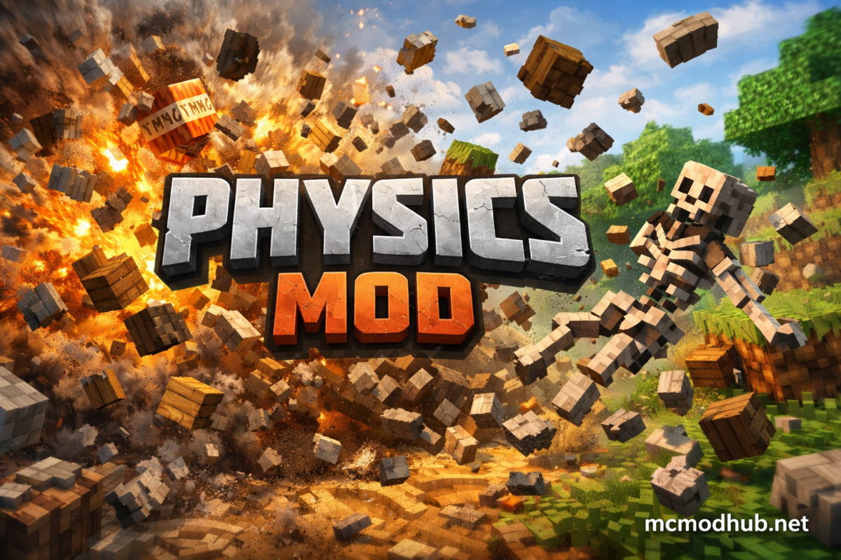 Physics Mod — популярный мод для Minecraft, который добавляет реалистичную физику блоков, зрелищные взрывы и динамические эффекты разрушений. После установки блоки разлетаются на части, предметы реагируют на окружение, а мир становится значительно живее. Поддерживаются версии Minecraft 1.16.5–1.21.11 и загрузчики Fabric, Forge и NeoForge.