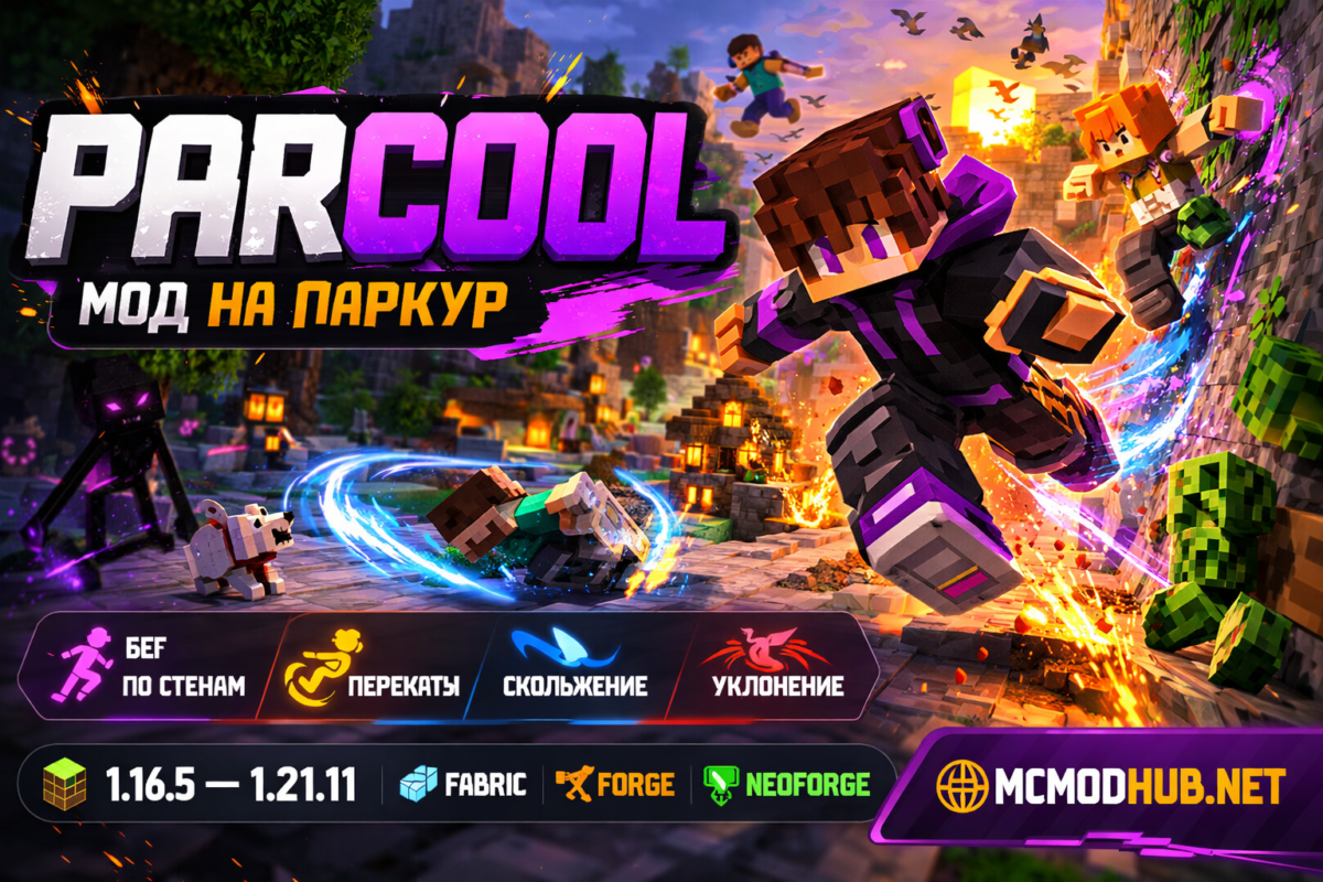 Parcool — мод для Minecraft, который полностью расширяет систему передвижения. Он добавляет паркур-механики: бег по стенам, перекаты, скольжение, уклонение, прыжки с разгона и другие элементы, превращающие обычное перемещение по миру в динамичный паркур-геймплей.