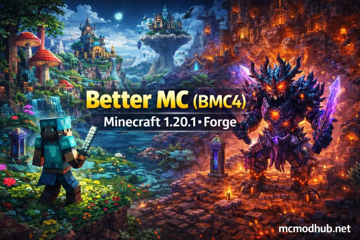 Better MC (BMC4) — популярный модпак для Minecraft 1.20.1 на Forge, который значительно расширяет ванильную игру. Он добавляет новые биомы, структуры, боссов, квесты и множество улучшений геймплея, сохраняя атмосферу оригинального Minecraft.