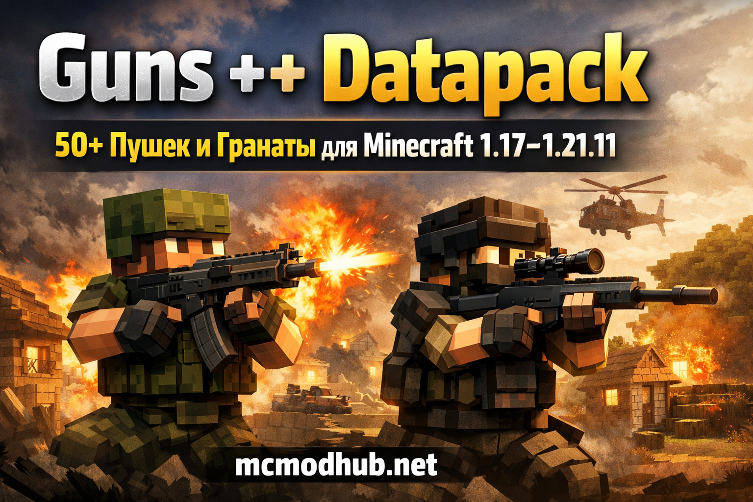 Guns ++ Datapack добавляет в Minecraft 50+ видов оружия и гранаты без тяжёлой модовой сборки. Пак подойдёт для выживания, PvP и серверов, где нужны кастомные модели, звуки, прицеливание, перезарядка и больше боевых возможностей.