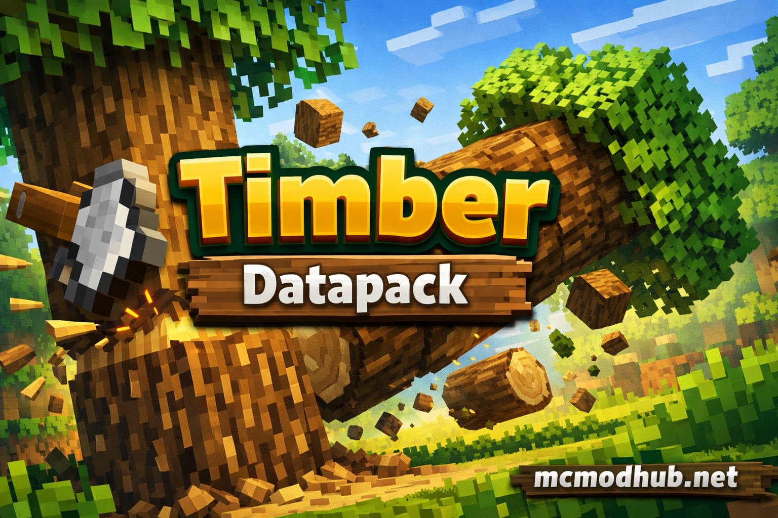 Timber Datapack добавляет в Minecraft удобную механику рубки деревьев одним ударом. Срубите нижний блок — и всё дерево упадёт сразу. Работает без модов и подходит для ванильных серверов.