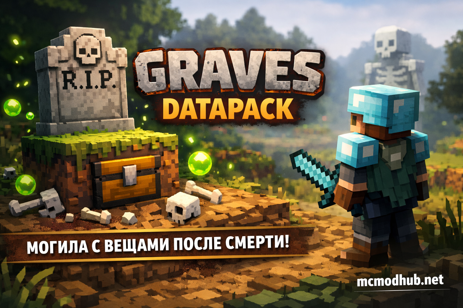 Graves Datapack — полезный датапак для Minecraft, который создаёт могилу после смерти игрока. Все предметы из инвентаря сохраняются внутри могилы, поэтому их можно спокойно забрать позже. Отличное QoL-улучшение для выживания, серверов и игры с друзьями.