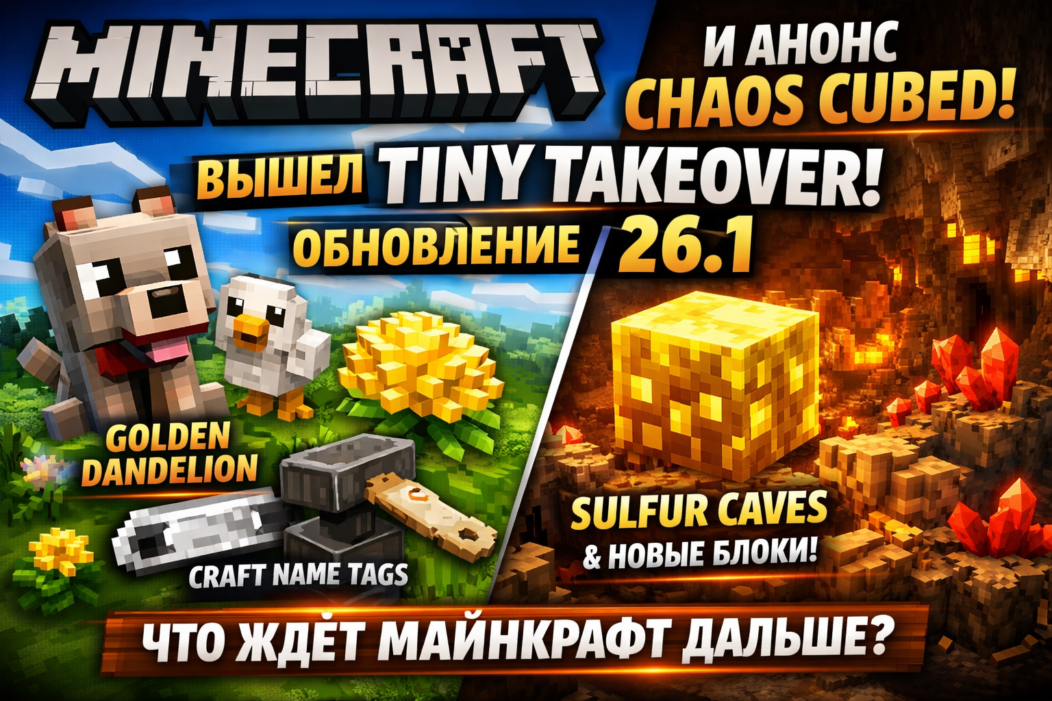 В Minecraft вышло обновление 26.1 и дроп Tiny Takeover с новыми детёнышами мобов, Golden Dandelion и крафтом бирок. А на Minecraft LIVE 2026 Mojang уже показала следующий game drop — Chaos Cubed с sulfur caves, новыми блоками и Sulfur Cube.