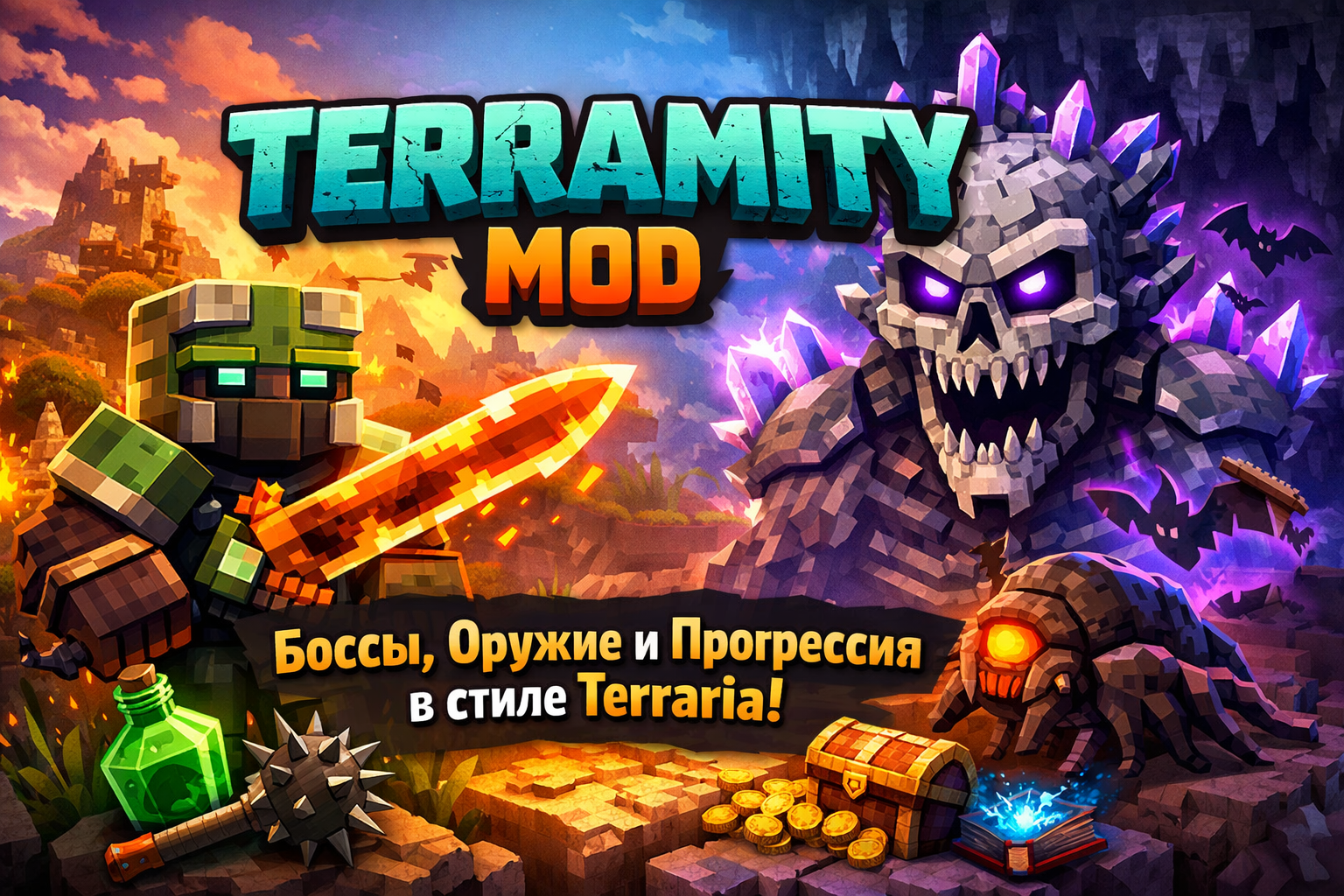 Terramity — мод для Minecraft, который добавляет боссов, оружие и RPG-прогрессию в стиле Terraria. Новые механики, сложные битвы и развитие персонажа.